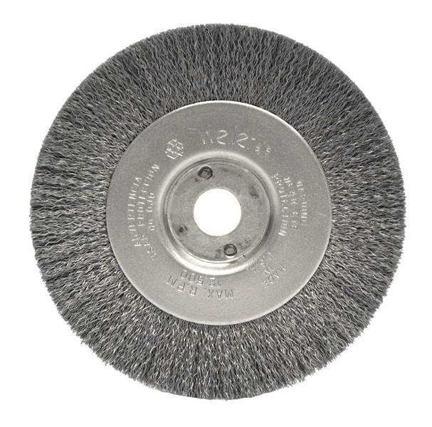 Weiler 4" Narrow Face Crimped Wire Wheel Brush provides a flexible brushing action and consistent performance for demanding light duty cleaning and deburring applications. Featuring Weiler's solid ring construction, these radial brushes are available in heat-treated steel, type 302 stainless steel and brass wire for use in a wide variety of applications. 1/2"-3/8" arbor hole for use on bench/pedestal grinder, CNC/milling/automatic machines and straight grinders.