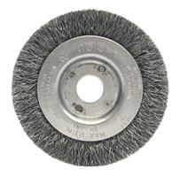 Weiler 3" Narrow Face Crimped Wire Wheel Brush provides a flexible brushing action and consistent performance for demanding light duty cleaning and deburring applications. Featuring Weiler's solid ring construction, these radial brushes are available in heat-treated steel, type 302 stainless steel and brass wire for use in a wide variety of applications. 1/2"-3/8" arbor hole for use on bench/pedestal grinder, CNC/milling/automatic machines and straight grinders.
