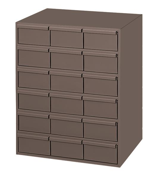 18 drawers (vertical), 11-5/8" deep, steel construction, for small part storage, gray
