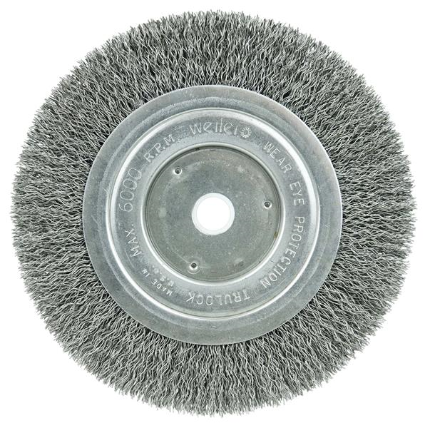 Weiler 6" Narrow Face Crimped Wire Wheel Brush provides a flexible brushing action and consistent performance for demanding light duty cleaning and deburring applications. Featuring Weiler's solid ring construction, these radial brushes are available in heat-treated steel, type 302 stainless steel and brass wire for use in a wide variety of applications. 5/8"-1/2" arbor hole for use on bench/pedestal grinder, CNC/milling/automatic machines and straight grinders.