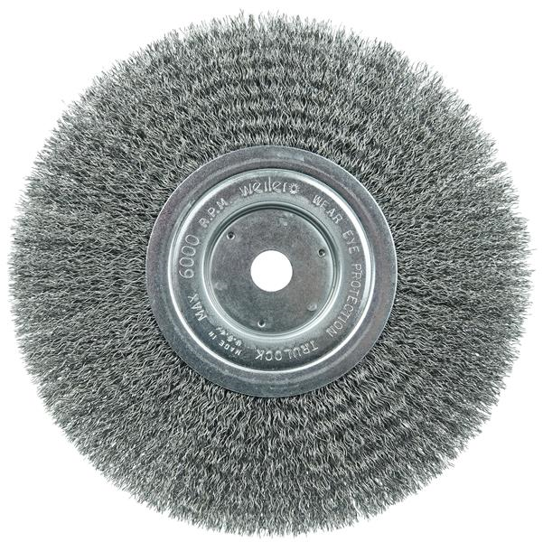 Weiler 8" Narrow Face Crimped Wire Wheel Brush provides a flexible brushing action and consistent performance for demanding light duty cleaning and deburring applications. Featuring Weiler's solid ring construction, these radial brushes are available in heat-treated steel, type 302 stainless steel and brass wire for use in a wide variety of applications. 5/8" arbor hole for use on bench/pedestal grinder, CNC/milling/automatic machines and straight grinders.