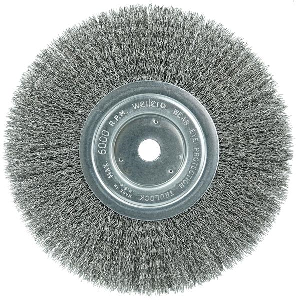 Weiler 8" Narrow Face Crimped Wire Wheel Brush provides a flexible brushing action and consistent performance for demanding light duty cleaning and deburring applications. Featuring Weiler's solid ring construction, these radial brushes are available in heat-treated steel, type 302 stainless steel and brass wire for use in a wide variety of applications. 5/8" arbor hole for use on bench/pedestal grinder, CNC/milling/automatic machines and straight grinders.