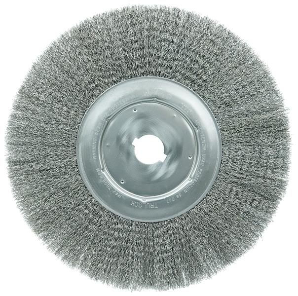 Weiler 12" Narrow Face Crimped Wire Wheel Brush provides a flexible brushing action and consistent performance for demanding light duty cleaning and deburring applications. Featuring Weiler's solid ring construction, these radial brushes are available in heat-treated steel, type 302 stainless steel and brass wire for use in a wide variety of applications. 1-1/4" arbor hole for use on bench/pedestal grinder, CNC/milling/automatic machines and straight grinders.