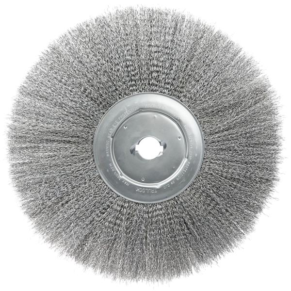 Weiler 15" Narrow Face Crimped Wire Wheel Brush provides a flexible brushing action and consistent performance for demanding light duty cleaning and deburring applications. Featuring Weiler's solid ring construction, these radial brushes are available in heat-treated steel, type 302 stainless steel and brass wire for use in a wide variety of applications. 1-1/4" arbor hole for use on bench/pedestal grinder, CNC/milling/automatic machines and straight grinders.