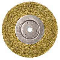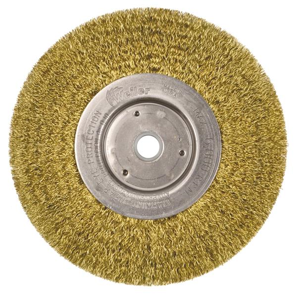 Weiler 6" Narrow Face Crimped Wire Wheel Brush provides a flexible brushing action and consistent performance for demanding light duty cleaning and deburring applications. Featuring Weiler's solid ring construction, these radial brushes are available in heat-treated steel, type 302 stainless steel and brass wire for use in a wide variety of applications. 5/8"-1/2" arbor hole for use on bench/pedestal grinder, CNC/milling/automatic machines and straight grinders.