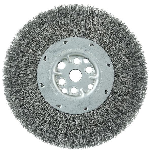 Weiler 7" Maximum Density Crimped Wire Wheel Brush features increased fill density for greater brushing action, longer life and consistent performance in the most demanding applications requiring the flexibility of a crimped wire wheel. 5/8"-1/2" arbor hole for use on bench/pedestal grinders.