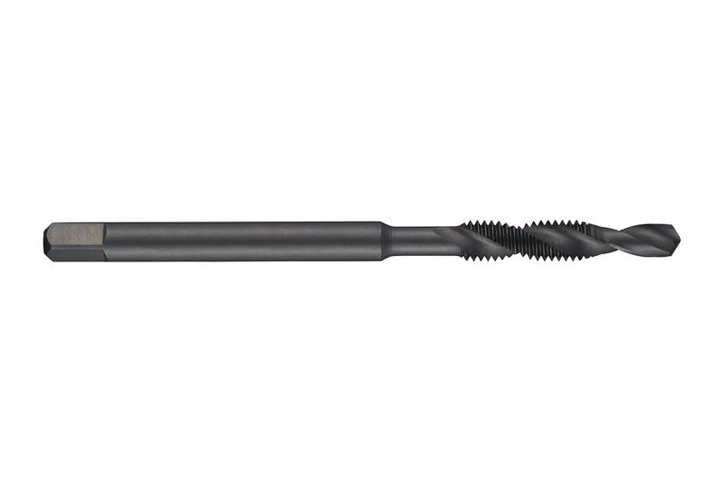Combination drill-tap with a 30? spiral flute, for ISO-Metric thread M3 with 0.50 mm pitch and 6H class of fit, dimensions according to DORMER-ISO standard with 3.15mm shank and 2.5mm square drive, HSS with steam tempered surface finish and 30? helix angle for 1.5xD through hole threading in free machining steel
