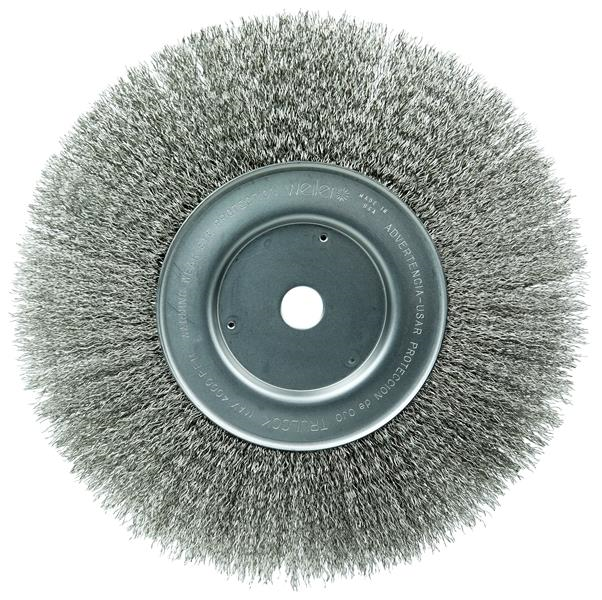 Weiler 10" Narrow Face Crimped Wire Wheel Brush provides a flexible brushing action and consistent performance for demanding light duty cleaning and deburring applications. Featuring Weiler's solid ring construction, these radial brushes are available in heat-treated steel, type 302 stainless steel and brass wire for use in a wide variety of applications. 3/4" arbor hole for use on bench/pedestal grinder, CNC/milling/automatic machines and straight grinders.