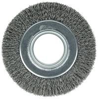 Weiler 6" Wide Face Crimped Wire Wheel provide a flexible brushing action and consistent performance for demanding light-duty cleaning and deburring applications on steel, armored steel, cast iron, ductile iron and tool steel parts. Maximum wire density and aggression and a wider face width to cover more area. 2" arbor hole for use on CNC/milling/automatic machine, bench/pedestal and straight grinders.