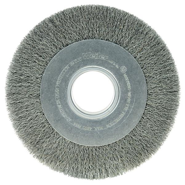 Weiler 8" Wide Face Crimped Wire Wheel provide a flexible brushing action and consistent performance for demanding light-duty cleaning and deburring applications on steel, armored steel, cast iron, ductile iron and tool steel parts. Maximum wire density and aggression and a wider face width to cover more area. 2" arbor hole for use on CNC/milling/automatic machine, bench and pedestal grinders.