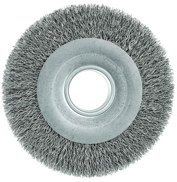 Weiler 8" Wide Face Crimped Wire Wheel provide a flexible brushing action and consistent performance for demanding light-duty cleaning and deburring applications on steel, armored steel, cast iron, ductile iron and tool steel parts. Maximum wire density and aggression and a wider face width to cover more area. 2" arbor hole for use on CNC/milling/automatic machine, bench and pedestal grinders.