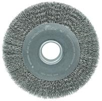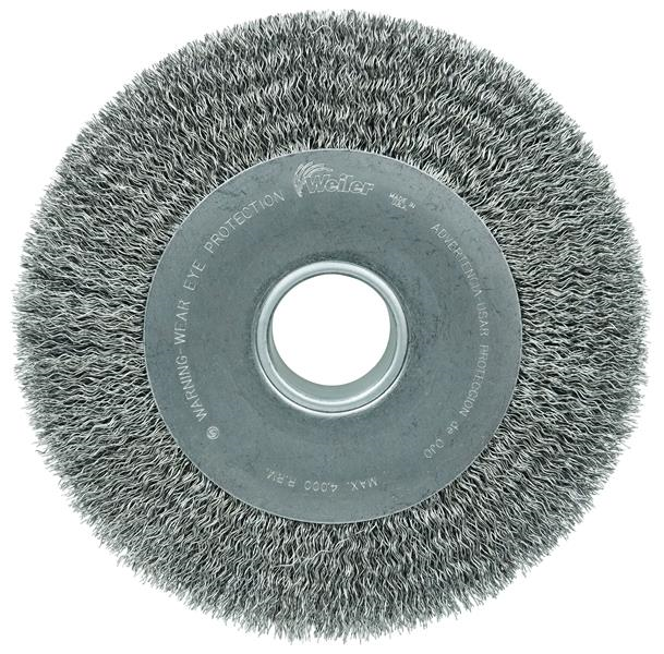 Weiler 10" Wide Face Crimped Wire Wheel provide a flexible brushing action and consistent performance for demanding light-duty cleaning and deburring applications on steel, armored steel, cast iron, ductile iron and tool steel parts. Maximum wire density and aggression and a wider face width to cover more area. 2" arbor hole for use on CNC/milling/automatic machine, bench and pedestal grinders.