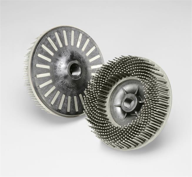 Scotch-Brite™ Bristle Disc, using ceramic abrasive grain and molded, flexible bristles, provides more surface contact than wire brushes and maintains abrasive property throughout the life of the disc. The fast-running disc removes paint, stains, adhesives, weld burns, rust, heavy oxides, and surface contaminants from large areas.