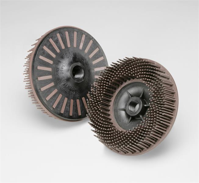 Scotch-Brite™ Bristle Disc, using ceramic abrasive grain and molded, flexible bristles, provides more surface contact than wire brushes and maintains abrasive property throughout the life of the disc. The fast-running disc removes paint, stains, adhesives, weld burns, rust, heavy oxides, and surface contaminants from large areas.