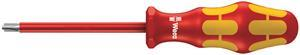 Wera VDE screwdrivers with multi-component Kraftform Plus handle for fast and low-fatigue working: hard gripping zones for high working speeds whereas soft zones ensure high torque transfer. Combination profile - slotted and Phillips particularly for jobs on terminal blocks, fuse boxes, switches and relays. Individually tested in water bath at 10,000 volts for secure work at the permissible voltage of 1,000 volts. The hexagonal anti-roll feature prevents any bothersome rolling away at the workplace.