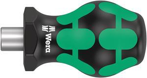Especially small bit-holding Stubby screwdriver handle with short blade for hard to reach areas. Suitable for the mounting of bits with 1/4" hexagon drive as per DIN ISO 1173-C 6.3 and Wera connection series 1.With strong permanent magnet, which also holds large and heavy screws. The 2-component Kraftform handle with its practical combination of hard and soft zones allows for a firm grip and precise working. The hexagon anti-roll protection prevents annoying rolling away of bits in the workplace.
