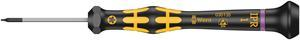 High quality Wera Micro screwdriver for precision mechanical jobs. Rapid twisting results from fixing the hand on the head and using the fast-turning zone just below. This makes time-consuming grip adjustments unnecessary. Power zones with integrated soft sections ensure the transfer of high loosening and tightening torque; a precision zone for the right rotation angle during fine adjustment work. The Black Point tip offers optimised corrosion protection and an exact fit.The electric surface resistance of the Wera ESD material is ? 10^9 ohm. This securely protects components against electrostatic energy and associated damage. "Take it easy" tool finder with colour coding according to profiles and size stamp ? for simple and rapid accessing of the required tool.