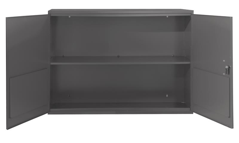 Wall Mounted Aerosol Storage Cabinet, 20 gauge, 1 shelf, 2 doors, 2 pockets on doors, pre-installed lock, key hole slots for wall mounting, gray