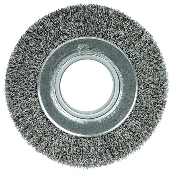 Weiler 6" Medium Face Crimped Wire Wheel provide a flexible brushing action and consistent performance for demanding light-duty cleaning and deburring applications on steel, armored steel, cast iron, ductile iron and tool steel parts. Featuring Weiler's solid ring construction, these radial brushes are available in heat-treated steel, type 302 stainless steel and brass wire. 2" arbor hole for use on CNC/milling/automatic machine, bench/pedestal and straight grinders.