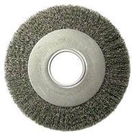 Weiler 8" Medium Face Crimped Wire Wheel provide a flexible brushing action and consistent performance for demanding light-duty cleaning and deburring applications on steel, armored steel, cast iron, ductile iron and tool steel parts. Featuring Weiler's solid ring construction, these radial brushes are available in heat-treated steel, type 302 stainless steel and brass wire. 2" arbor hole for use on CNC/milling/automatic machine, bench and pedestal grinders.