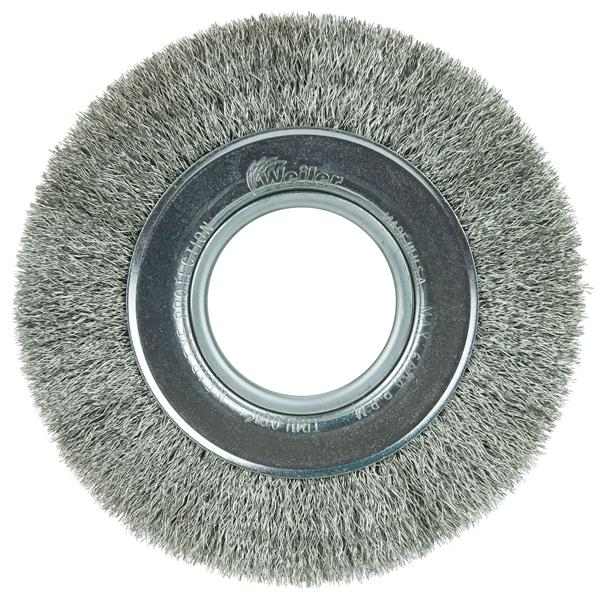 Weiler 6" Medium Face Crimped Wire Wheel provide a flexible brushing action and consistent performance for demanding light-duty cleaning and deburring applications on stainless steel, aluminum, brass, bronze, copper, high-nickel alloys, inconel, pewter, platinum and titanium parts. Featuring Weiler's solid ring construction, these radial brushes are available in heat-treated steel, type 302 stainless steel and brass wire. 2" arbor hole for use on CNC/milling/automatic machine, bench/pedestal and straight grinders.