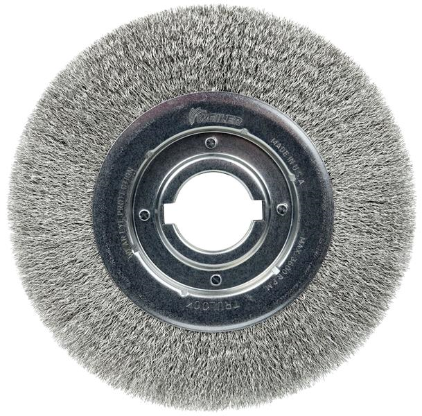 Weiler 10" Medium Face Crimped Wire Wheel provide a flexible brushing action and consistent performance for demanding light-duty cleaning and deburring applications on stainless steel, aluminum, brass, bronze, copper, high-nickel alloys, inconel, pewter, platinum and titanium partparts. Featuring Weiler's solid ring construction, these radial brushes are available in heat-treated steel, type 302 stainless steel and brass wire. 2" arbor hole for use on CNC/milling/automatic machine, bench and pedestal grinders.