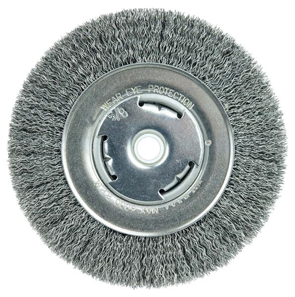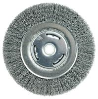 Wolverine 6" Wide Face Crimped Wire Bench Grinder Wheel provides a flexible brushing action and consistent performance for demanding light-duty cleaning and deburring applications on steel, armored steel, cast iron, ductile iron and tool steel parts. Features a wider face width to cover more surface area. 5/8"-1/2" arbor hole for use on CNC/milling/automatic machine, bench, pedestal and straight grinders.