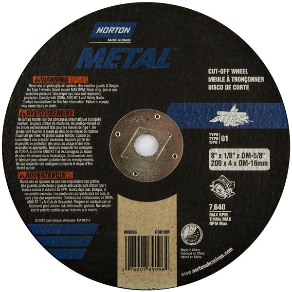 The Norton circular saw cut-off line consists of type 01 straight wheels, in 6-1/2 -8 in. diameters to find all standard size circular saw machines. Most include a 5/8" arbor with a diamond shape (DM) punch out adapter. These wheels come in ultra thin .035 in. for quick burn/burr free cutting to 1/8 in. for more durable applications. All are reinforced for the demanding nature of portable cut-off and are offered in Z/A and A/O abrasive for metal and S/C abrasive for masonry.