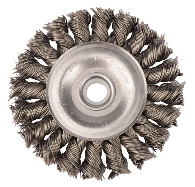 Weiler 3" Standard Twist Knot Wire Wheel Brush provides a heavy-duty brushing action with some flexibility for demanding deburring cleaning and surface preparation applications on somewhat irregular surfaces. Featuring Weiler's individual knot hole construction, these radial brushes are available in heat-treated steel, type 302 stainless steel and bronze wire for use in a wide variety of applications. 1/2"-3/8" arbor hole for use on bench/pedestal grinder, die grinder, right angle die grinder and straight grinders.