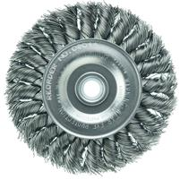 Weiler 4" Standard Twist Knot Wire Wheel Brush provides a heavy-duty brushing action with some flexibility for demanding deburring cleaning and surface preparation applications on somewhat irregular surfaces. Featuring Weiler's individual knot hole construction, these radial brushes are available in heat-treated steel, type 302 stainless steel and bronze wire for use in a wide variety of applications. 1/2"-3/8" arbor hole for use on bench/pedestal grinder, die grinder, right angle die grinder and straight grinders.