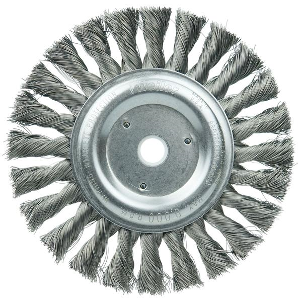 Weiler 6" Standard Twist Knot Wire Wheel Brush provides a heavy-duty brushing action with some flexibility for demanding deburring cleaning and surface preparation applications on somewhat irregular surfaces. Featuring Weiler's individual knot hole construction, these radial brushes are available in heat-treated steel, type 302 stainless steel and bronze wire for use in a wide variety of applications.5/8"-1/2" arbor hole for use on bench/pedestal grinder, die grinder, right angle die grinder and straight grinders.