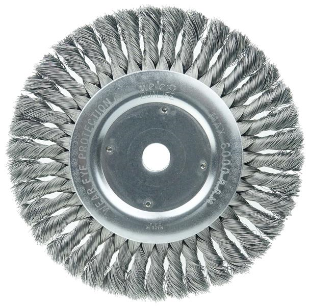 Weiler 8" Standard Twist Knot Wire Wheel Brush provides a heavy-duty brushing action with some flexibility for demanding deburring cleaning and surface preparation applications on somewhat irregular surfaces. Featuring Weiler's individual knot hole construction, these radial brushes are available in heat-treated steel, type 302 stainless steel and bronze wire for use in a wide variety of applications. 3/4" arbor hole for use on bench/pedestal grinder, die grinder, right angle die grinder and straight grinders.