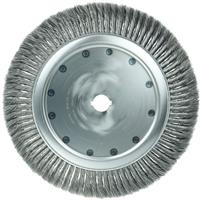 Weiler 14" High Density Standard Twist Knot Wire Wheel Brush is engineered for maximum performance in production applications. Featuring Weiler's individual knot hole construction, these radial brushes are available in heat-treated steel, type 302 stainless steel and bronze wire for use in a wide variety of applications. 1-1/4" arbor hole for use on automated equipment such as dedicated gear deburring machines.