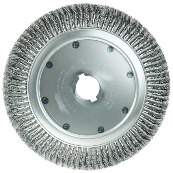 Weiler 14" High Density Standard Twist Knot Wire Wheel Brush is engineered for maximum performance in production applications. Featuring Weiler's individual knot hole construction, these radial brushes are available in heat-treated steel, type 302 stainless steel and bronze wire for use in a wide variety of applications. 2" arbor hole for use on automated equipment such as dedicated gear deburring machines.
