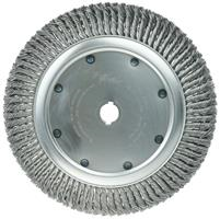 Weiler 14" High Density Standard Twist Knot Wire Wheel Brush is engineered for maximum performance in production applications. Featuring Weiler's individual knot hole construction, these radial brushes are available in heat-treated steel, type 302 stainless steel and bronze wire for use in a wide variety of applications. 1-1/4" arbor hole for use on automated equipment such as dedicated gear deburring machines.