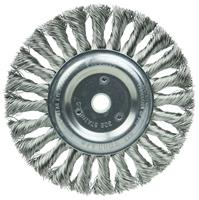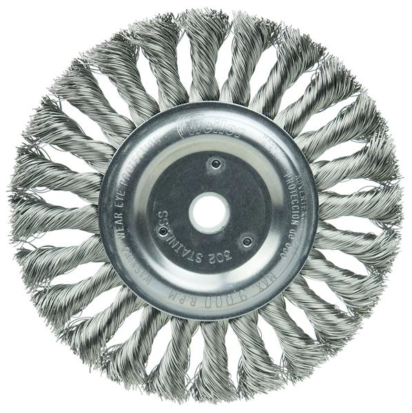 Weiler 6" Standard Twist Knot Wire Wheel Brush provides a heavy-duty brushing action with some flexibility for demanding deburring cleaning and surface preparation applications on somewhat irregular surfaces. Featuring Weiler's individual knot hole construction, these radial brushes are available in heat-treated steel, type 302 stainless steel and bronze wire for use in a wide variety of applications. 5/8"-1/2" arbor hole for use on bench/pedestal grinder, die grinder, right angle die grinder and straight grinders.