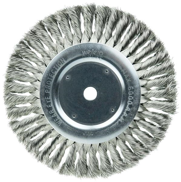 Weiler 8" Standard Twist Knot Wire Wheel Brush provides a heavy-duty brushing action with some flexibility for demanding deburring cleaning and surface preparation applications on somewhat irregular surfaces. Featuring Weiler's individual knot hole construction, these radial brushes are available in heat-treated steel, type 302 stainless steel and bronze wire for use in a wide variety of applications. 5/8" arbor hole for use on bench/pedestal grinder, die grinder, right angle die grinder and straight grinders.