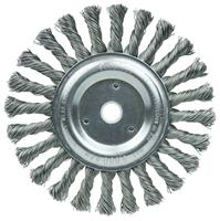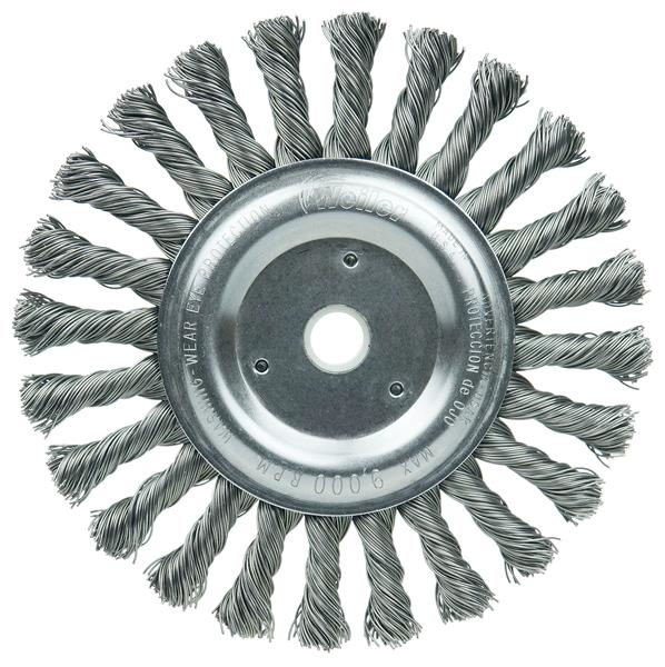 Weiler 6" Cable Twist Knot Wire Wheel Brush provides maximum brushing action with minimal flexibility. Ideal for demanding cleaning and coating removal applications on relatively smooth surfaces. 5/8"-1/2" arbor hole for use on right angle grinders.