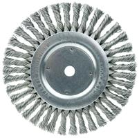 Weiler 8" Cable Twist Knot Wire Wheel Brush provides maximum brushing action with minimal flexibility. Ideal for demanding cleaning and coating removal applications on relatively smooth surfaces. 5/8" arbor hole for use on bench/pedestal grinder, CNC/milling/automatic machines.