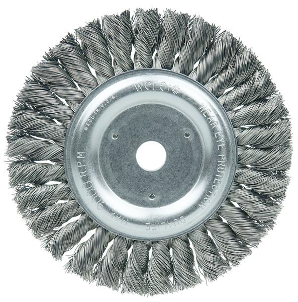 Weiler 6" Standard Twist Knot Wire Wheel Brush provides a heavy-duty brushing action with some flexibility for demanding deburring cleaning and surface preparation applications on somewhat irregular surfaces. Featuring Weiler's individual knot hole construction, these radial brushes are available in heat-treated steel, type 302 stainless steel and bronze wire for use in a wide variety of applications. 5/8"-1/2" arbor hole for use on bench/pedestal grinder, die grinder, right angle die grinder and straight grinders.
