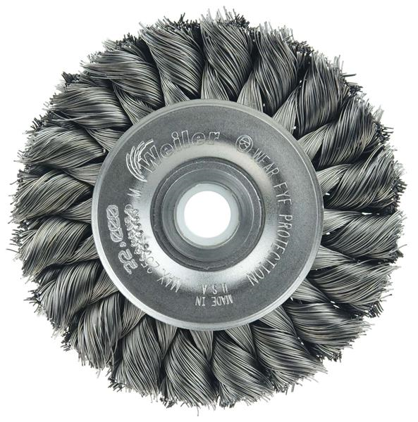 Weiler 3" Standard Twist Knot Wire Wheel Brush provides a heavy-duty brushing action with some flexibility for demanding deburring cleaning and surface preparation applications on somewhat irregular surfaces. Featuring Weiler's individual knot hole construction, these radial brushes are available in heat-treated steel, type 302 stainless steel and bronze wire for use in a wide variety of applications. 5/8"-1/2" arbor hole for use on bench/pedestal grinder, die grinder, right angle die grinder and straight grinders.
