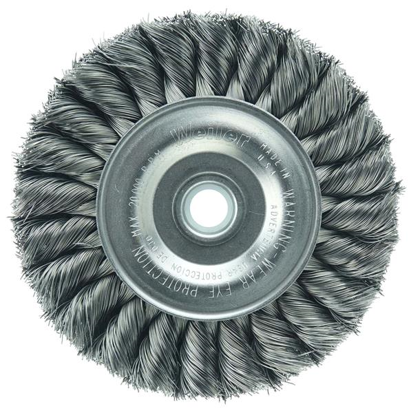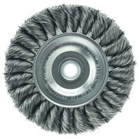 Weiler 4" Standard Twist Knot Wire Wheel Brush provides a heavy-duty brushing action with some flexibility for demanding deburring cleaning and surface preparation applications on somewhat irregular surfaces. Featuring Weiler's individual knot hole construction, these radial brushes are available in heat-treated steel, type 302 stainless steel and bronze wire for use in a wide variety of applications. 1/2"-3/8" arbor hole for use on bench/pedestal grinder, die grinder, right angle die grinder and straight grinders.