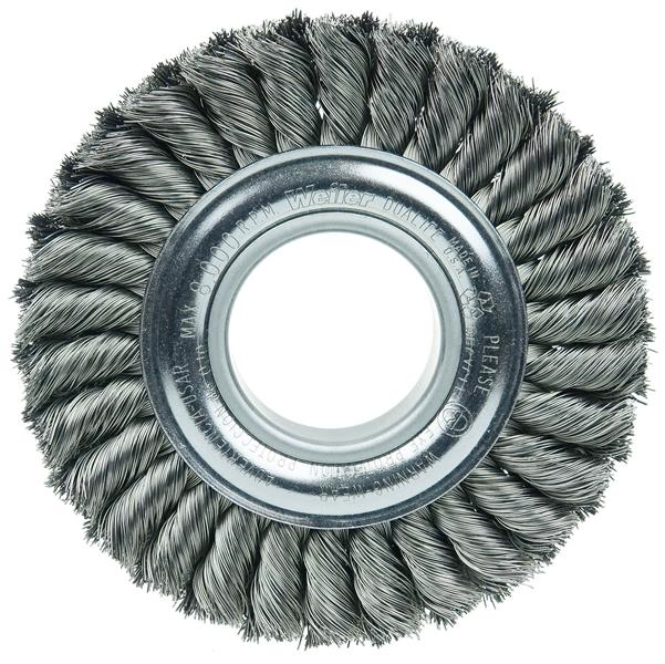 Weiler 6" Standard Twist Knot Wire Wheel Brush provides a heavy-duty brushing action with some flexibility for demanding deburring cleaning and surface preparation applications on somewhat irregular surfaces. Featuring Weiler's individual knot hole construction, these radial brushes are available in heat-treated steel, type 302 stainless steel and bronze wire for use in a wide variety of applications. 2" arbor hole for use on bench/pedestal grinder, die grinder, right angle die grinder and straight grinders.