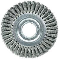 Weiler 8" Standard Twist Knot Wire Wheel Brush provides a heavy-duty brushing action with some flexibility for demanding deburring cleaning and surface preparation applications on somewhat irregular surfaces. Featuring Weiler's individual knot hole construction, these radial brushes are available in heat-treated steel, type 302 stainless steel and bronze wire for use in a wide variety of applications. 2" arbor hole for use on bench/pedestal grinder, die grinder, right angle die grinder and straight grinders.