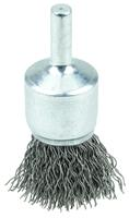 Weiler 3/4" Crimped Wire End Brush features a solid end construction and very flexible brushing action. Ideal for more demanding light duty cleaning applications in corners and hard-to-reach areas. 1/4" stem diameter for use on die grinder, drill, drill press and right angle air die grinder.