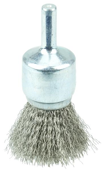 Weiler 3/4" Crimped Wire End Brush features a solid end construction and very flexible brushing action. Ideal for more demanding light duty cleaning applications in corners and hard-to-reach areas. 1/4" stem for use on die grinder and right angle air die grinder.