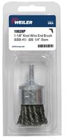 Weiler 1-1/8" Knot Wire End Brush features a hollow end and heavy-duty brushing action with some flexibility for more demanding cleaning and deburring applications in recessed areas. 1/4" stem diameter for use on die grinder and right angle die grinders. This product is clamshell packed for retail.
