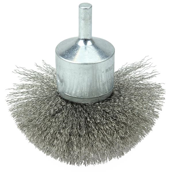 Weiler 3" Circular Flared Crimped Wire End Brush features crimped wire fill which has been "pre-flared" to match the working angle of the brush at operating speed and suited for addressing broad and slightly contoured surfaces. 1/4" stem diameter for use on die grinder and right angle die grinders.
