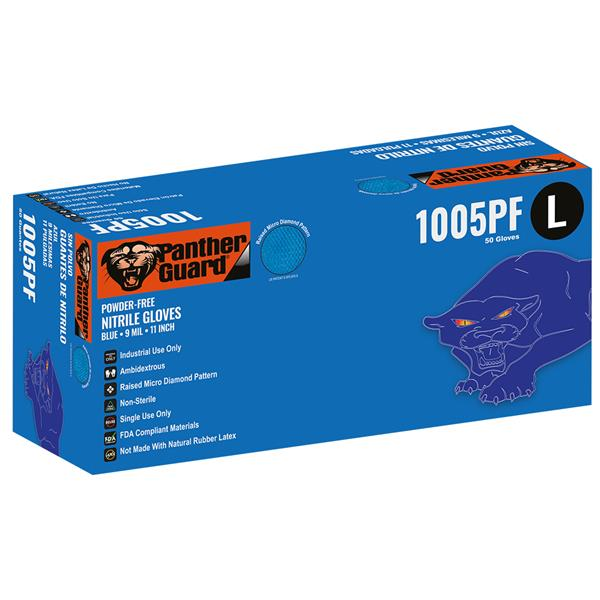 These gloves are made of 9 mil premium powder-free heavyweight nitrile. They feature a unique raised micro diamond pattern. They are disposable, ambidextrous, 11 inches in length, and have a rolled/beaded cuff. They come 50 gloves to a dispenser box, 10 dispenser boxes per case and comply with FDA regulations for food contact.