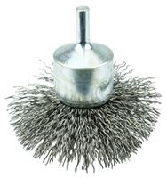 Weiler 3" Circular Flared Crimped Wire End Brush features wire fill which has been "pre-flared" to match the working angle of the brush at operating speed and suited for addressing broad and slightly contoured surfaces on steel parts. 1/4" stem diameter for use on die grinder, drill, drill press and right angle air die grinder.